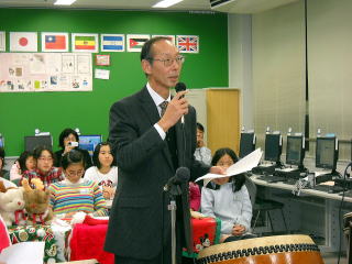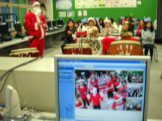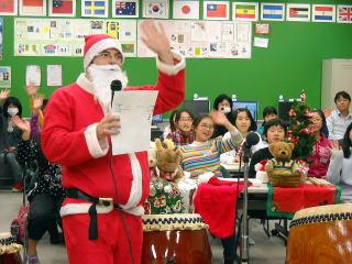 日本からは美加の台小学校の有志が和太鼓を披露していただきました。司会は河内長野市のネイティブの英語教師のマイケル先生でサンタクロースを演じていただきました。とても楽しい交流になりました。最後に参加してくれた子どもたちにサンタクロースからチョコレートのプレゼントがありました。