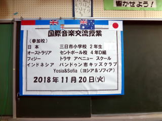 2018年11月20日(火)午前10時から日本・オーストラリア・フィジー・インドネシアの4カ国で音楽交流会がおこなわれました。日本から参加していただいたのは三日市小学校の2年生の3クラスです。オーストラリアからは語学協働学習でいつもお世話になっているセントポール校の4年生、フィジーからはトラサアベニュー校の5年生そして、インドネシアからはバンドゥン市のキッズクラブのお二人が参加していただきました。それぞれの国からとても素晴らしい音楽や人形劇などの演技を披露していただきました。