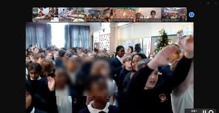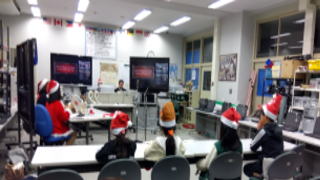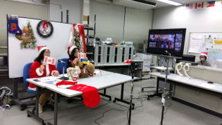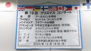 2024年12月16日(月)午後6時から恒例のクリスマスコンサートがメディアセンターで行われました。今年はJICAのご支援によりアフリカのモザンビークの孤児院の子ども達も参加することができました。また新しい市長さんも見学に来ていただき、ご挨拶していただきました。ご多用の中、ありがとうございます。今年はZoom機能がバージョンアップされたためか、会話での音声はクリアでしたが、音楽は背景の雑音と認識され、リアル参加の学校から音楽が途中でよく途切れました。とても残念です。対応するための設定変更がネットで紹介されていますが、なかなか先生方には確認・調整が難しいかったようです。しかしビデオ音楽での参加校の演技は素晴らしいものばかりでした。参加いただいたのは、イギリス、フィンランド、インドネシア、フィリピン、ハワイ、カナダ、モザンビークと日本の8ヶ国の9つの学校です。