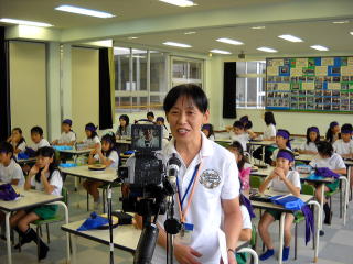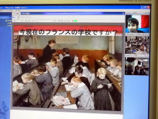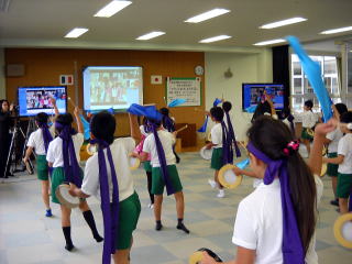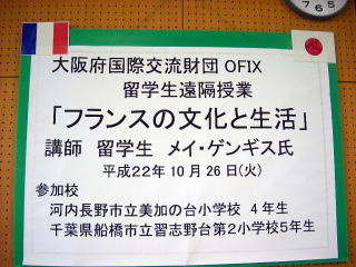 平成22年10月26日(火) 大阪府国際交流財団OFIXからの遠隔授業「フランスの生活と文化」が行われました。今回の講師はフランスから来られたメイ・ゲンギスさんです。授業ではフランスの生活やスポーツなどについて写真を提示していただきながら楽しく教えていただきました。メイさんはとても日本語が上手で子供の質問に丁寧に答えていただきました。お礼に美加の台小学校からは運動会での演技「「沖縄の踊り」を披露しました。