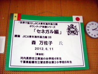 2012年6月11日(月)午後1時45分から大阪府国際交流財団(OFIX)と美加の台小学校と千葉県船橋市立習志野台第2小学校とを繋いだ遠隔授業が行われました。今回の授業の講師は青年海外協力隊員として「セネガル」で小学校での教育活動を通して国際貢献活動をされていた森 万佐子さんです。写真や資料などを提示していただき、またクイズなどもあってとても楽しい授業でした。森万佐子さん本当にありがとうございました。